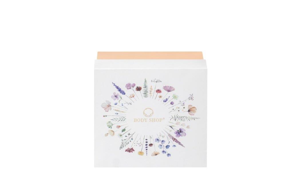 קופסת מתנה קטנה, מעוצבת ומיוחדת מבית BODY SHOP, בהשראת עולם הטבע. הקופסה הלבנה מעוטרת בפרחים צבעוניים בסידור מעגלי סביב לוגו המותג, ומעניקה מראה נקי, אלגנטי ומרשים.